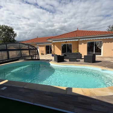 A l'extérieur, vous profitez d’une grande terrasse, d’une piscine couverte et d'un jaccuzzi couvert sous dôme ainsi que d’une cabane de jardin.